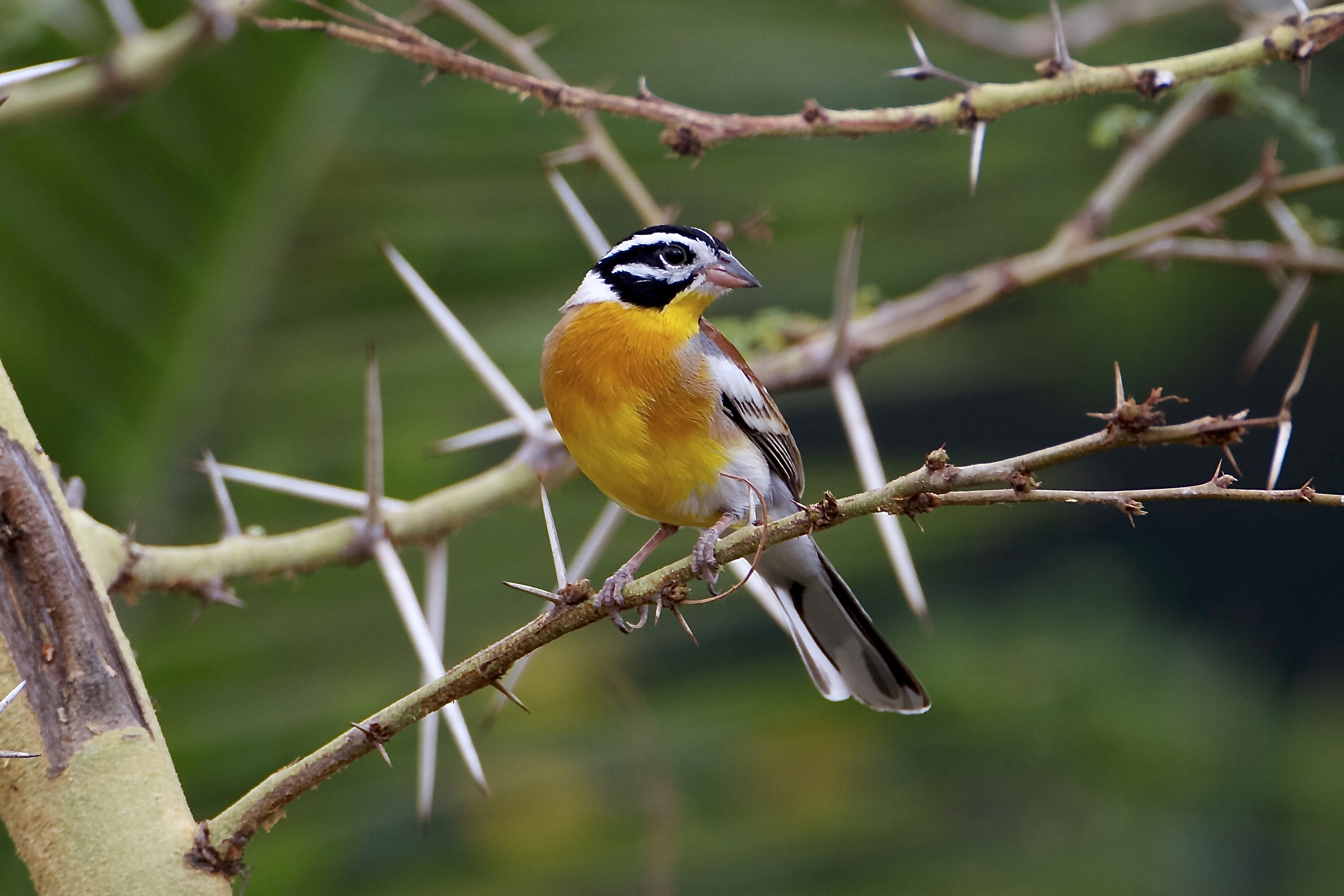 African Golden-breasted Bunting is a stunningly-colored seed-eater with a brilliant golden breast, a yellow throat, a boldly black-and-white striped head, a chestnut back, and white wingbars. When flushed, it shows white outer tail feathers. The female is duller. Pairs and small flocks are resident, but make local movements in arid savanna and broadleaf woodland, where they forage on the ground and fly up into trees when flushed or singing.